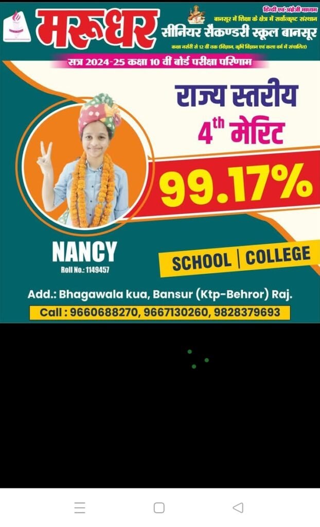 बानसूर कस्बे में 10वीं बोर्ड परीक्षा में 99.17% अंक प्राप्त कर राज्य स्तर पर चौथा स्थान प्राप्त करने वाली नैनसी यादव के सम्मान में भव्य रैली का आयोजन सोमवार दिनांक 16जून 2025 को किया जाएगा। यह रैली मरुधर स्कूल से प्रातः 8 बजे प्रारंभ होकर मुख्य मार्गों से होते हुए वापस मरुधर स्कूल पहुंचेगी।