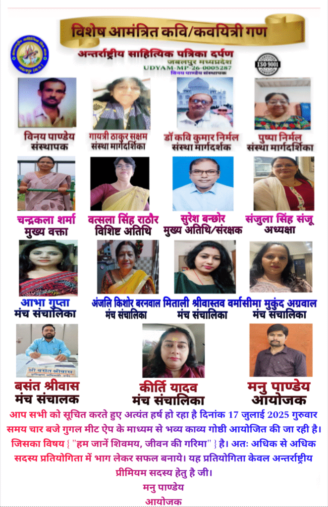 अंतर्राष्ट्रीय साहित्यिक मित्र मंडल,जबलपुर म.प्र. से भव्य काव्य सम्मेलन।मुख्य अतिथि सुरेश बन्छोर जी के सौजन्य से दिनांक 17 जुलाई 2025 दिन गुरुवार अन्तर्राष्ट्रीय साहित्यिक मित्र मंडल जबलपुर ,मध्यप्रदेश के समूह 1,2,3,4,5 की काव्य गोष्ठी हर्षोल्लास से संपन्न हुई जिसमें विभिन्न प्रदेशों के साहित्यकारों ने अपनी प्रस्तुति देकर कार्यक्रम को भव्य और दिव्य स्वरूप प्रदान किया।विषय “हम जानें शिवमय, जीवन की गरिमा ” आधारित काव्यात्मक अभिव्यक्ति की प्रशंसा करती हुई संस्था मार्गदर्शिका गायत्री ठाकुर सक्षम जी ने बताया कि भारत की समृद्ध साहित्यिक विरासत के संरक्षण व संवर्धन हेतु ऐसे वृहत साहित्यिक मंच की भूमिका महत्वपूर्ण हो जाती है जिससे रचनाकारों की अभिव्यक्ति सामने आती है व साहित्यिक ज्ञान बढ़ता है।काव्य गोष्ठी का कार्यक्रम ठीक चार बजे संध्याकाल से शुरू होकर रात 09:56 रात्रि तक अनवरत चलता रहा ।कार्यक्रम इतना रोचक था कि कोई भी प्रतिभागी मंच छोड़कर नहीं गया। इस कार्यक्रम की मुख्य वक्ता चन्द्रकला शर्मा,विशिष्ट अतिथि वत्सला स.अ. जी,मुख्य अतिथि सुरेश बन्छोर व अध्यक्षा संजुला सिंह संजु जी थीं । इस सुंदर कार्यक्रम का आयोजन सम्मानित पटल के संस्थापक विनय पान्डेय जी के द्वारा किया गया जिसमें डॉ॰ कवि कुमार निर्मल , प्रत्युष मनु पान्डेय का सहयोग पूर्ण रूप से रहा।कार्यक्रम की शुरुआत माँ वीणापाणि की सुंदर वंदना से हुई। सरस्वती वंदना डॉक्टर रमेश कुमार निर्मेष जी द्वारा प्रस्तुत की गई । सभी साहित्यकारों का काव्य पाठ अति सुंदर व मनभावन रहा। आभा गुप्ता, अंजलि किशोर बरनवाल, मिताली श्रीवास्तव वर्मा,सीमा मुकुंद अग्रवाल, बसंत श्रीवास वसंत एवं कीर्ति यादव जी का संचालन सरस एवं सुरेश बन्छोर जी एवं चन्द्रकला शर्मा जी व वत्सला जी की समीक्षा मन को प्रसन्न कर गई। उपरोक्त कवि सम्मेलन में निम्नलिखित सदस्यों ने काव्य पाठ किया है- गायत्री ठाकुर सक्षम,डॉ रमेश कुमार निर्मेष,डॉ कवि कुमार निर्मल,पुष्पा निर्मल,डॉ सुमन मेहरोत्रा,कुसुम अशोक सुराणा,उषा सूद,सुषमा सिंह उर्मी,अपर्णा पोद्दार शैलजा,अमिता मराठे,डॉ अर्चना पंडित,विजयलक्ष्मी भारद्वाज,पुष्पांजलि देवी,मधुलिका बाजपेयी तिवारी,मधु स्वामी गाजियाबाद,ललिता अग्रवाल आशना,पूनम शुक्ला शिक्षिका,ममता गुरुपंच बेमेतरा,राज किरण मिश्रा,कविता मोटवानी,अपराजिता राजोरिया,इंदु उपाध्याय,सीमा सुरेश पटेल,संतोषी डनसेना रुही,लक्ष्मी डहरिया,सुमन गर्ग दिल्ली,डॉ राजेश कुमार जैन,डॉ अनुपम भारद्वाज मिश्रा,रश्मि वर्मा,सविता शर्मा मुम्बई,डॉ मधुकर राव लारोकर,नन्दलाल मणि त्रिपाठी,अनामिका निधि,अंजू कमलेश,डॉ अंजली सामंत,अन्नपूर्णा स अ हापुड़,डॉ हस्तीमल आर्य हस्ती,राम अवत