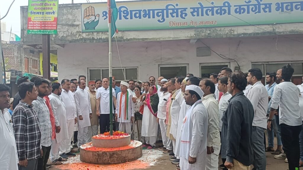 मनावर। प्रदेश टुडे।। स्वतंत्रता दिवस के अवसर स्थानीय कांग्रेस भवन पर वरिष्ठ कांग्रेस नेता मावजी भाई पटेल जोतपुर के द्वारा झंडा फहराया गया। वरिष्ठ नेता मावजी भाई पटेल का 15 अगस्त को उनका 100 वा जन्म दिन होने से कांग्रेसजनों ने केक काट कर फूल माला पहनाई तथा शाल श्री फल देकर सम्मानित किया गया। कार्यक्रम में नगर कांग्रेस अध्यक्ष ओम सोलंकी, महेंद्र सिंह पिपरिमान, अशोक काकरेचा, ओम पाटीदार जोतपुर, राजेश पंवार, रविन्द्र पाटीदार, लक्ष्मी जाट, अख्तर बी, मुकेश पाटीदार जोतपुर, राजेश ठाकुर, आरिफ मंसूरी, सैयद इरशाद अली, इकबाल दाऊद उपस्थित रहे।