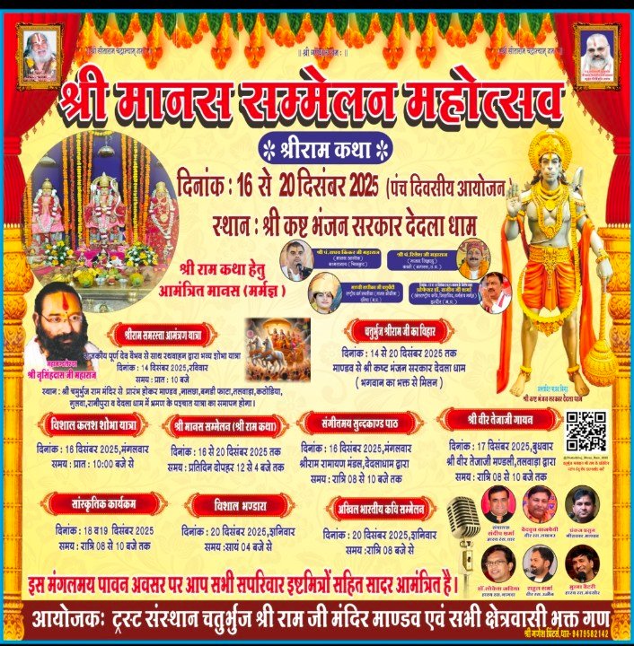 चतुर्भुज राम मंदिर के महामंडलेश्वर पीठाधीश्वर डॉक्टर नरसिंह दास महाराज ने जानकारी देते हुए बताया कि दिनांक 14 दिसंबर रविवार को श्री राम समरसता यात्रा राजकीय पूर्ण देव वैभव के साथ रथ वाहन द्वारा भव्य शोभा यात्रा वही 16 दिसंबर से 20 दिसंबर तक मानस सम्मेलन महोत्सव होगा वही 16 दिसंबर को सुबह 10:00 बजे से कष्टभंजन सरकार देदला ग्राम कलश यात्रा और शोभायात्रा निकालजाएगी वहीं हर राज्य के बड़े-बड़े संतों का आगमन होगा साथ ही रामचरित्र मानस पाठ व्यास श्री पं. राघव किंकर जी महाराज (मानस आलोक) कामतानाथ (चित्रकुट),श्री पं. रितेश जी महाराज (मानस जिज्ञासु) काशी (बनारस, उ.प्र.),साध्वी राधीका जी चतुर्वेदी राष्ट्रीय धर्म प्रचारीका (मानस कोकीला) दतिया (म.प्र.) ,प्रोफेसर डॉ. राजीव जी शर्मा (अंतराष्ट्रीय कवि, शिक्षाविद, धर्मग्रंथ मर्मज्ञ)इन्दौर (म.प्र.) संत राम चरित्र मानस पाठ करेगे वही 20 दिसंबर को मानस सम्मेलन महोत्सव समापन पर एक विशाल भंडारे भोजन प्रसादी का आयोजन किया जाएगा माही रात्रि में 8:00 बजे से कवि सम्मेलन का कार्यक्रम होगा जिसमें देश के जाने-माने राष्ट्रीय कवि संदीप शर्मा धार,राष्ट्रीय कवि वेदवृद बाजपेयी लखनऊ उत्तर प्रदेश , राष्ट्रीय कवि पंकज प्रसून मांडू, डॉ लोकेश जड़िया नागदा, राष्ट्रीय कवि राहुल शर्मा उज्जैन, राष्ट्रीय कवि मुन्ना बैटरी मंदसौर, मौजूद रहेंगे वही
