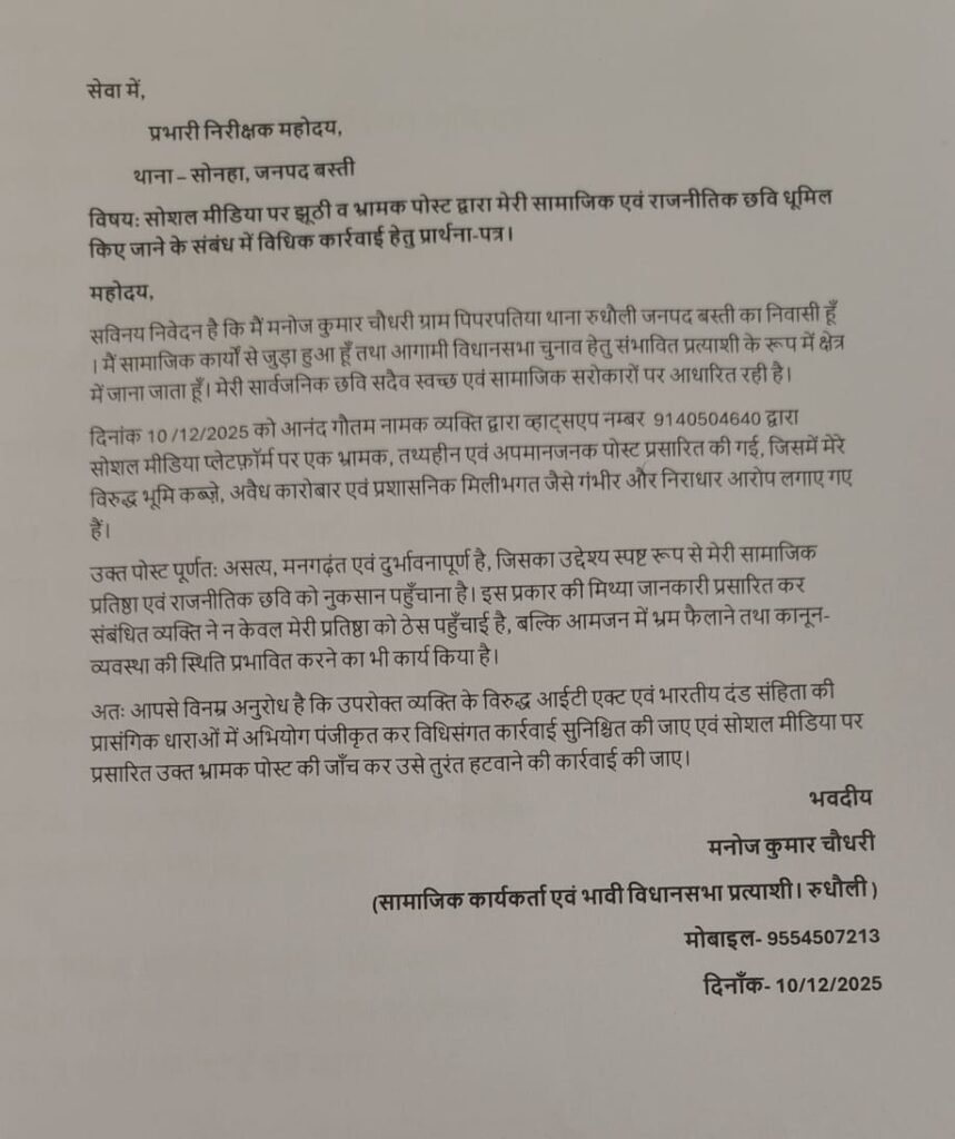 प्रार्थना-पत्र में कहा गया है कि यह पोस्ट न केवल उनकी सामाजिक एवं राजनीतिक प्रतिष्ठा को नुकसान पहुँचाने वाली है, बल्कि आमजन में भ्रम फैलाने और शांति व्यवस्था पर प्रतिकूल प्रभाव डालने वाली भी है। मनोज चौधरी ने थाना प्रभारी से आईटी एक्ट एवं भारतीय दंड संहिता की प्रासंगिक धाराओं में अभियोग पंजीकृत करने, भ्रामक पोस्ट हटवाने तथा भविष्य में इस प्रकार की फर्जी एवं भड़काऊ सामग्री प्रसारित होने से रोकने हेतु आवश्यक कार्रवाई करने का अनुरोध किया है।