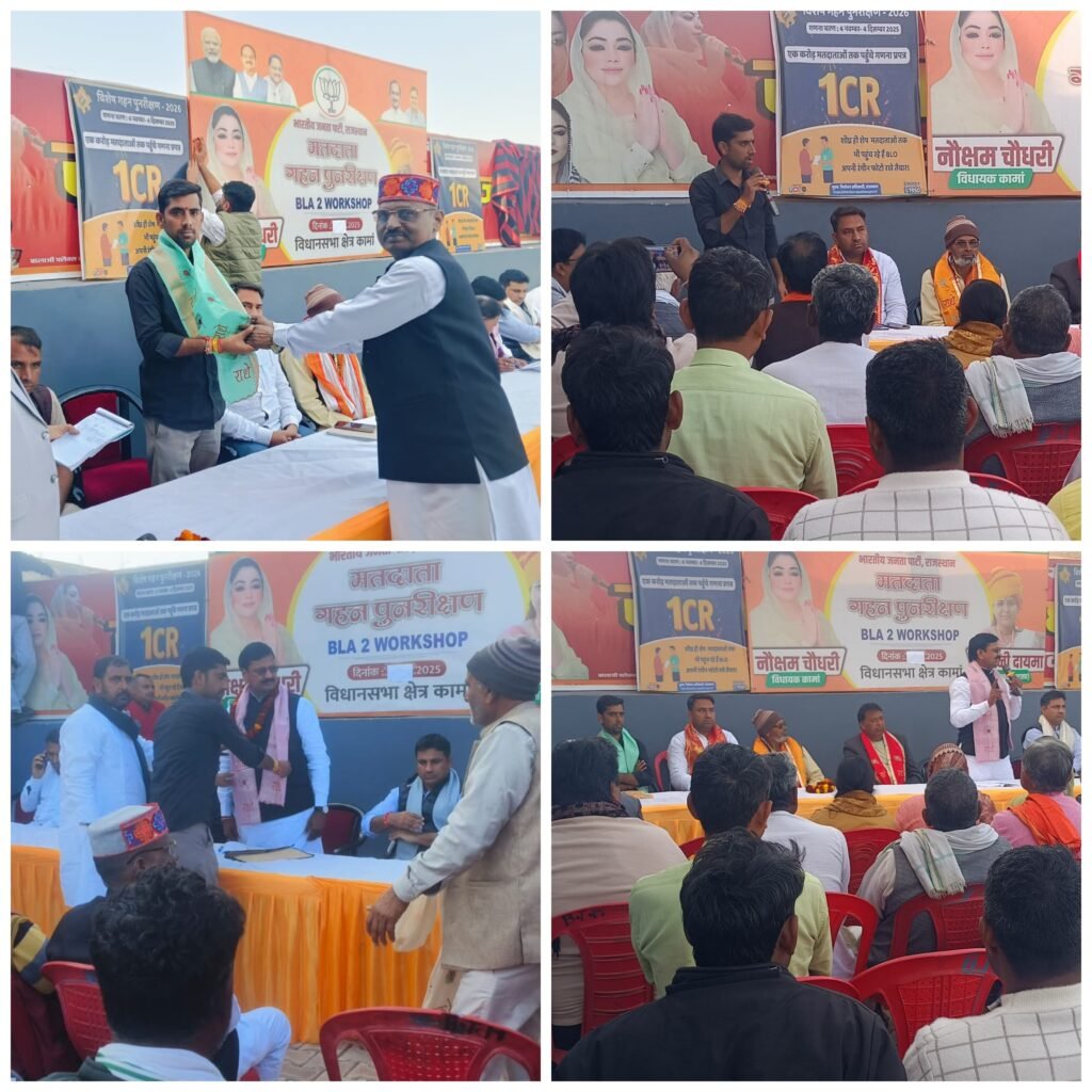 कामां – डीग जिले के कस्बा कामां में वुधवार दिनांक 24.12.2025 को S I R को लेकर कामा विधायक नोक्षम चौधरी कार्यालय पर शहर मंडल अध्यक्ष रवि तिवारी की अध्यक्षता में बैठक आयोजित की गई जिसमें मुख्य अतिथि भरतपुर जिले के प्रभारी नरेश बंसल व सह प्रभारी चेतन चौधरी व जिला उपाध्यक्ष बृजेश अग्रवाल रहे ! S I R को लेकर जिला प्रभारी नरेश जी भाई साहब अपने विचार रखें मतदाता सूची में कोई भी मतदाता का नाम नहीं चूकना चाहिए और तीन चरणों में मतदाता सूची सर्वे होगा जिसमें कोई मतदाता का नाम रह गया हो वह फॉर्म अप्लाई कर सकता है और मतदाता सूची में नाम गलत है तो उसका भी शुद्धिकरण हो सकता है सभी BLO 2 निर्देश दिए अभी से अपने क्षेत्र में जाकर शुद्धिकरण करवाऐ जिसमें भाजपा के पूर्व जिला उपाध्यक्ष निहाल मीणा पहाड़ी मंडल अध्यक्ष बच्चू छावडी, गोपालगढ़ मंडल अध्यक्ष राजेश सोनी, ग्रामीण मंडल अध्यक्ष राजेश राजपूत, केथवाडा मंडल अध्यक्ष मोहन श्याम यादव, जुरहरा मंडल अध्यक्ष नारायण दत्त शर्मा, अल्पसंख्यक मोर्चा जिला अध्यक्ष याकूब राजपूत, हरि साहू, युवा मोर्चा उपाध्यक्ष पंकज सिंह ,लक्ष्मण प्रसाद, शीला जाटव, सर्वेश सैनी, गोपाल जाटव ,राजवीर पहाड़ी ,बिल्टू शर्मा ,पूर्व मंडल अध्यक्ष शाकिर अली, पूर्व मंडल अध्यक्ष बिल्लू गोयल, लखन गुर्जर ,पप्पू धोबी, पहलाद गुर्जर ,किशोर तिवारी, फंटूलाल ,गोपाल जाटव, निर्मला चौधरी, सतपाल सिंह, रमेश मंगला ,ओम प्रकाश जाटव, भगवान गुप्ता, घनश्याम ट्रेलर ,अशोक शर्मा, रविंद्र तरगोत्रा, लखन सैनी, घनश्याम लोदा ,दीपक बोहरा विक्रम शर्मा, दीपक गर्ग, श्याम विलोद साहित कार्यकर्ता मौजूद रहे