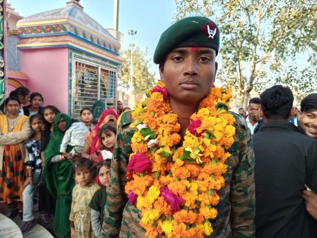 मुस्करा हमीरपुर।भारतीय सेना में अग्निवीर के रूप में ट्रेनिंग पूरी कर लौटे हिमांशु कुशवाहा के आगमन पर सोमवार को मुस्करा कस्बा गर्व और उल्लास से भर उठा 20 वर्षीय हिमांशु जो कस्बा मुस्करा के निवासी चन्द्रकरण कुशवाहा के पुत्र हैं जैसे ही अपने गांव लौटे उनका स्वागत अभूत पूर्व सम्मान के साथ किया गया। डीजे की धुनों और बैंड-बाजों की थाप पर युवा झूमते नजर आए, वहीं जगह-जगह लोगों ने फूल-मालाओं और जयकारों के साथ हिमांशु का अभिनंदन किया।