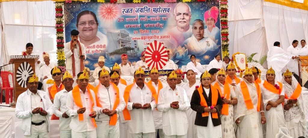 मनावर। जिला धार।। ब्रह्माकुमारी सेवा केंद्र मनावर द्वारा सेवा के 25 वर्ष पूर्ण होने के उपलक्ष्य में आज रजत जयंती महोत्सव एवं 25 समर्पित भाई–बहनों के सम्मान समारोह का भव्य आयोजन किया गया। कार्यक्रम की शुरुआत दीप प्रज्वलन से हुई, इसके पूर्व कलशयात्रा नगर के प्रमुख मार्गों से होते हुए कार्यक्रम स्थल पहुंची। बड़ी संख्या में नागरिकों तथा श्रद्धालुओं ने इस यात्रा में सहभागिता की। कार्यक्रम में मुख्य वक्ता के रूप में पधारे जस्टिस बीडी राठी ने सभी 25 तपस्वी भाई–बहनों को ईश्वरीय सौगात भेंट कर सम्मानित किया तथा उनके सेवाभाव की सराहना करते हुए कहा कि “पिछले 25 वर्षों से ईश्वरीय मर्यादाओं पर चलकर जो सेवा कार्य किया गया है, वही तपस्या आज फलित हो रही है और सेवा केंद्र की उन्नति इसका प्रमाण है।” इस अवसर पर समाजसेवी सुरेश गुप्ता, डॉ. सतीश फाटक तथा विशिष्ट अतिथि पूर्व सांसद छतर सिंह दरबार जी ने भी अपने विचार व्यक्त किए। धार्मिक विभाग से नारायण भाई ने सभी को शुभकामनाएं प्रेषित कीं।