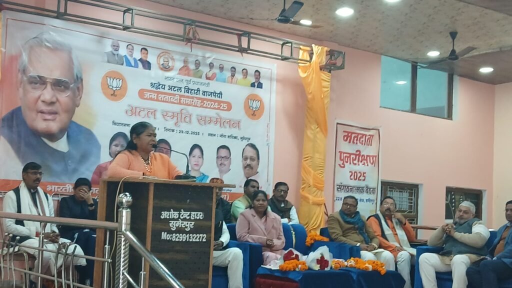 सुमेरपुर हमीरपुर। कस्बे के एक गेस्ट हाउस में सदर विधानसभा क्षेत्र में अटल स्मृति सम्मेलन का आयोजन जिलाध्यक्ष शकुंतला निषाद की अध्यक्षता में किया गया। कार्यक्रम की मुख्य अतिथि साध्वी निरंजन ज्योति ने विधानसभा स्तर पर होने वाले अटल स्मृति सम्मेलन के साथ-साथ पुनरीक्षण 2025 संगठनात्मक बैठक में एसआईआर के संबंध में जानकारी दी।