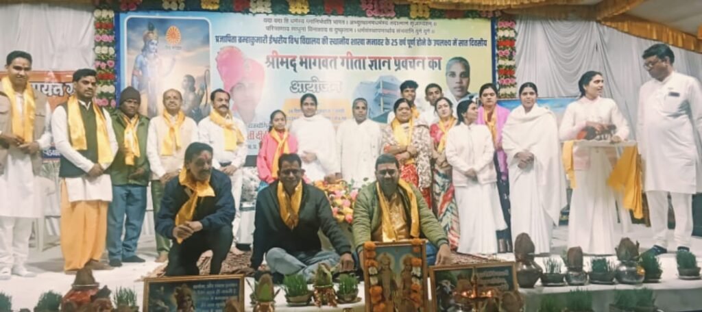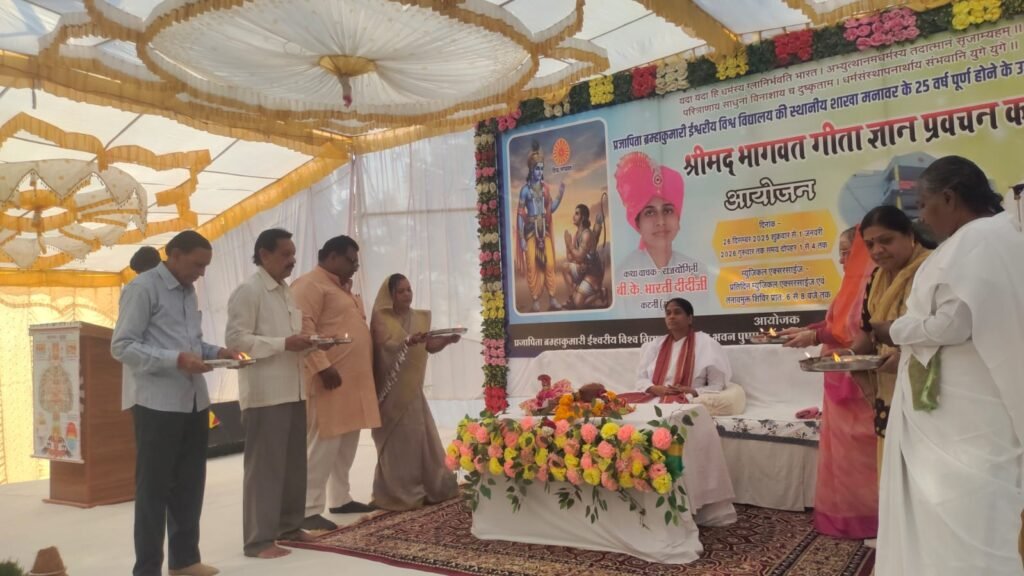 मनावर। जिला धार।। धार रोड स्थित खंडेलवाल मांगलिक भवन परिसर में प्रजापिता ब्रह्माकुमारी ईश्वरीय विश्वविद्यालय द्वारा केंद्र के रजत जयंती समारोह के अंतर्गत आयोजित सात दिवसीय श्रीमद् भागवत गीता प्रवचन का दौर जारी है। प्रवचन के चतुर्थ दिवस कटनी से पधारी कथावाचिका ब्रह्माकुमारी भारती दीदी जी ने कल्पवृक्ष के आध्यात्मिक रहस्य को बताते हुए कहा कि वास्तविकता में कल्पवृक्ष संपूर्ण सृष्टि का केंद्र बिंदु है । उन्होंने धर्म ग्रंथो के महत्व को प्रतिपादित करते हुए बताया कि अगर धर्म ग्रंथो को समझना है तो उनकी गहराई में जाना पड़ेगा ।क्योंकि धर्म ग्रंथ इतने साधारण नहीं है। परमात्मा को जानना इतना आसान नहीं है क्योंकि भगवान ने गीता में कहां है कि तुम मुझे जहां ढूंढ रहे हो मैं वहां हु ही नहीं। ईश्वर हम सब की आत्मा में बसे हुए हैं। ईश्वर को ढूंढना हो तो स्वयं की आत्मा में ही ढूंढना होगा। प्रवचन के पश्चात कार्यक्रम के मुख्य अतिथि साहित्यकार विश्वदीप मिश्रा, विशेष अतिथि साहित्यकार स्वप्निल शर्मा, कौशिक पंडित, नगर पालिका पूर्व दरोगा रमेश सोलंकी, उमरबन की कवयित्री रश्मि श्रीमाली,योगेश भाई, गोदावरी बहिन ने श्रीमद् भागवत गीता जी की आरती कर आशीर्वाद प्राप्त किया।