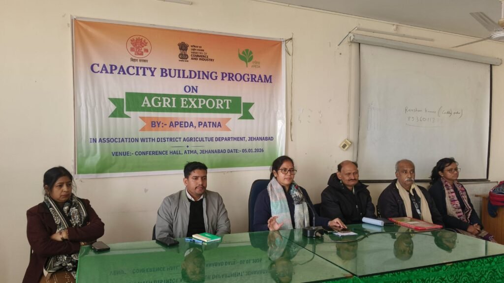 संवाददाता। रणजीत कुमार। जहानाबाद। कृषि एवं प्रसंस्कृत खाद्य उत्पाद निर्यात विकास प्राधिकरण (एपीडा) द्वारा बिहार सरकार के कृषि विभाग के सहयोग से एटीएमए कॉन्फ्रेंस हॉल, कृषि भवन, जहानाबाद में कृषि निर्यात विषय पर एक दिवसीय क्षमता निर्माण कार्यक्रम का आयोजन किया गया। कार्यक्रम के दौरान जिला कृषि पदाधिकारी श्रीमती शम्भावना द्वारा जिले की कृषि संभावनाओं पर प्रकाश डालते हुए जहानाबाद में उपलब्ध प्रमुख कृषि उत्पादों, उनके उत्पादन की स्थिति तथा राज्य एवं केंद्र सरकार द्वारा संचालित विभिन्न कृषि योजनाओं की जानकारी दी गई।