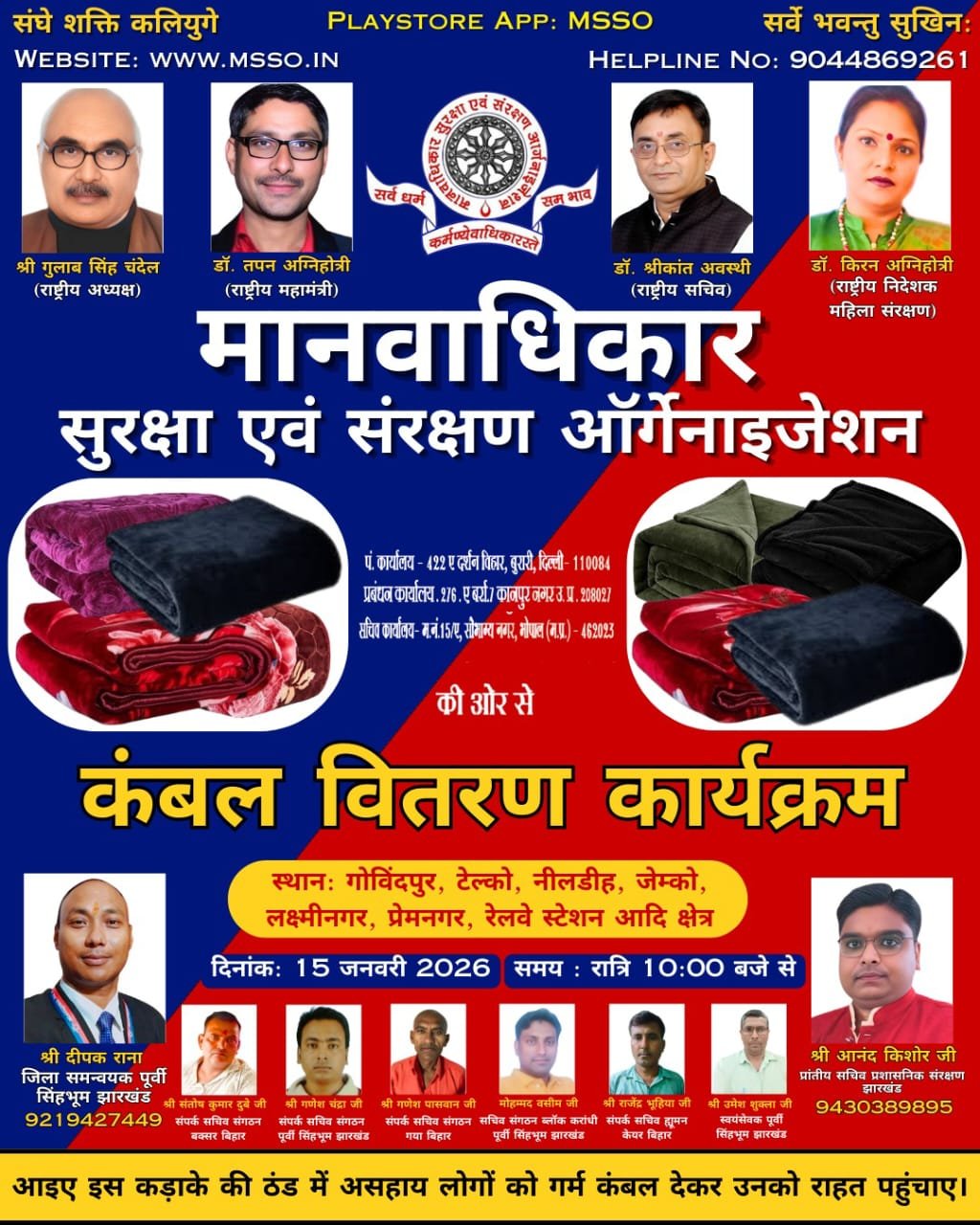 मानवाधिकार सुरक्षा एवं संरक्षण संगठन के तत्वावधान में दिनांक 15 जनवरी 2026 को एक विशेष रात्रिकालीन सेवा अभियान का आयोजन किया जाएगा। यह अभियान रात्रि 10 बजे गोविंदपुर से प्रारंभ होकर टेल्को, नीलडीह, जेम्को, लक्ष्मीनगर, प्रेमनगर, रेलवे स्टेशन होते हुए साकची तक संचालित किया जाएगा।