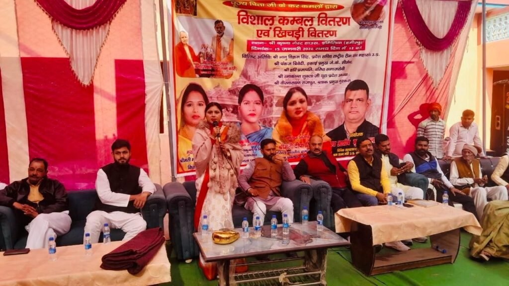 हमीरपुर। श्री राम मंदिर प्राण प्रतिष्ठा की द्वितीय वर्षगांठ एवं मकर संक्रांति के पावन अवसर पर लल्लू प्रसाद शुक्ला, सेवानिवृत्त मजिस्ट्रेट के कर कमलों से विशाल कंबल एवं खिचड़ी वितरण कार्यक्रम का आयोजन किया गया। यह कार्यक्रम 15 जनवरी 2026 को मंदिर परिसर/श्री कृष्णा गेस्ट हाउस, इमलिया, हमीरपुर में श्रद्धा एवं सेवा भाव के साथ संपन्न हुआ। कार्यक्रम का आवाह्न लल्लू प्रसाद शुक्ला के पुत्र आशीष शुक्ला द्वारा किया गया। उनके नेतृत्व में मंदिर परिसर में जरूरतमंदों के लिए कंबल एवं खिचड़ी वितरण का व्यापक आयोजन कराया गया। कार्यक्रम में विशिष्ट अतिथि के रूप में भानु विक्रम सिंह (प्रदेश सचिव, राष्ट्रीय टीम योग महासंघ उत्तर प्रदेश), पंकज त्रिवेदी (इकाई प्रमुख, जेके सीमेंट), हरि प्रजापति (वरिष्ठ समाजसेवी), रमाकांत शुक्ला (प्रदेश अध्यक्ष, यूटा), वीर नारायण राजपूत (ब्लॉक प्रमुख, मुस्करा), एडवोकेट आशीष कुमार शुक्ला (विशिष्ट सलाहकार) उपस्थित रहे।