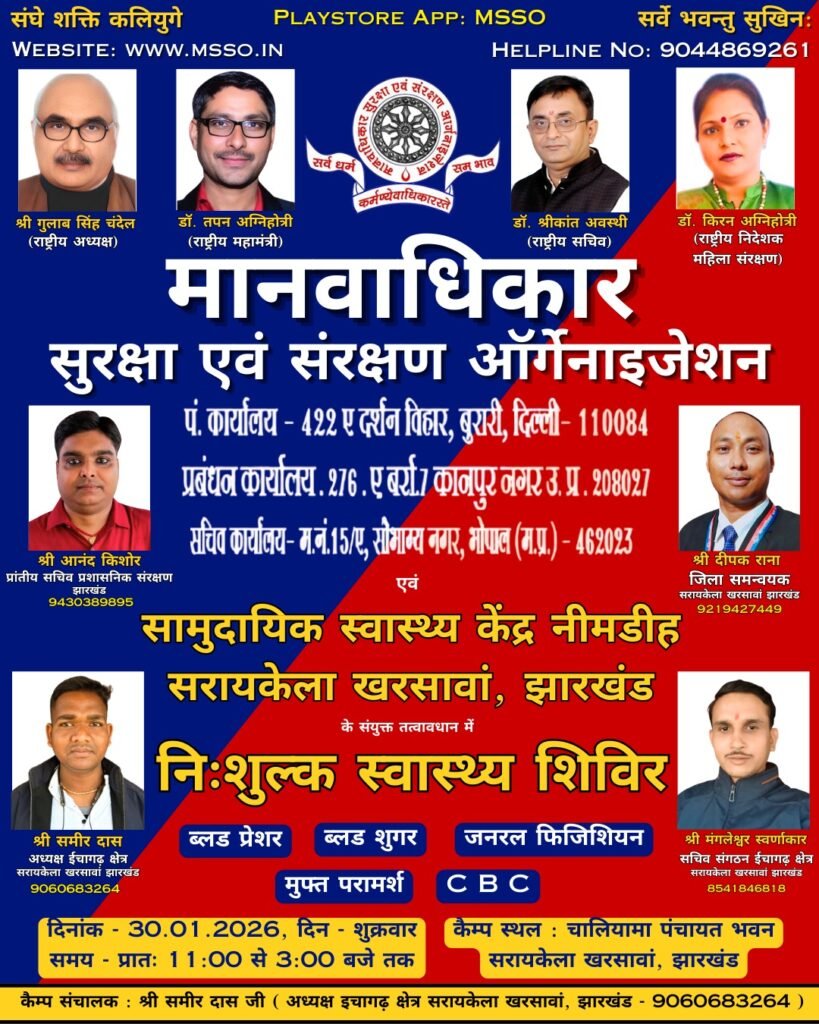 मानवाधिकार सुरक्षा एवं संरक्षण ऑर्गनाइजेशन (MSSO) के तत्वावधान में तथा सामाजिक स्वास्थ्य केंद्र, नीमडीह के संयुक्त सहयोग से सरायकेला-खरसावां जिले में एक भव्य नि:शुल्क स्वास्थ्य शिविर का आयोजन किया जा रहा है। यह स्वास्थ्य शिविर 30 जनवरी 2026 (शुक्रवार) को प्रातः 11:00 बजे से अपराह्न 3:00 बजे तक आयोजित होगा।