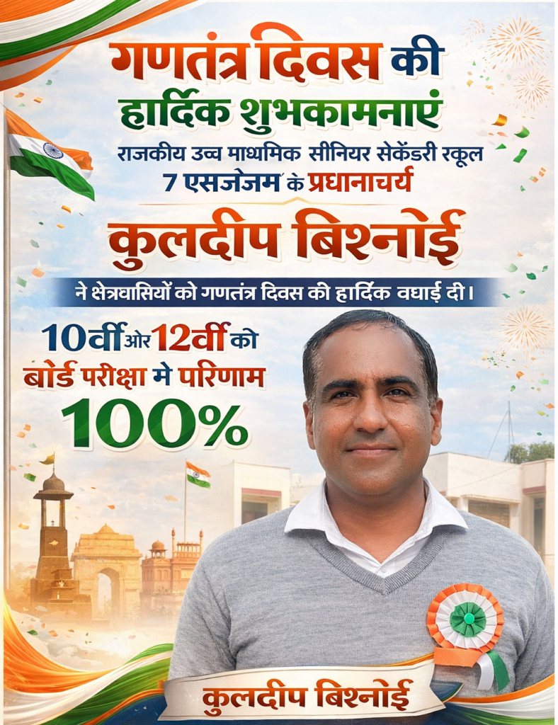 राजकीय उच्च माध्यमिक सीनियर स्कूल 7 एस क्लाइमेट के खेल मैदान बिश्नोई ने गणतंत्र दिवस पर क्षेत्रवासियों को हार्दिक शुभकामनाएं दी। उन्होंने स्कूल के 10वीं और 12वीं बोर्ड परीक्षा में छात्रों को 100% परिणाम, इस्पात और ढांचे की मेहनत के परिणाम बताए। यह उपलब्धि विद्यालय की वैज्ञानिक विशिष्टता को दर्शाती है।