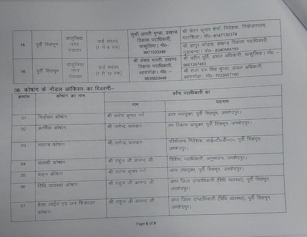 मानगो नगर निगम के लिए निर्वाची पदाधिकारी निदेशक एनईपी श्री संतोष कुमार गर्ग, जुगसलाई नगर परिषद के लिए विशिष्ट अनुभाजन पदाधिकारी श्री राहुल जी आनंद जी तथा चाकुलिया नगर पंचायत के लिए अनुमंडल पदाधिकारी घाटशिला श्री सुनील चंद्र को नियुक्त किया गया है।