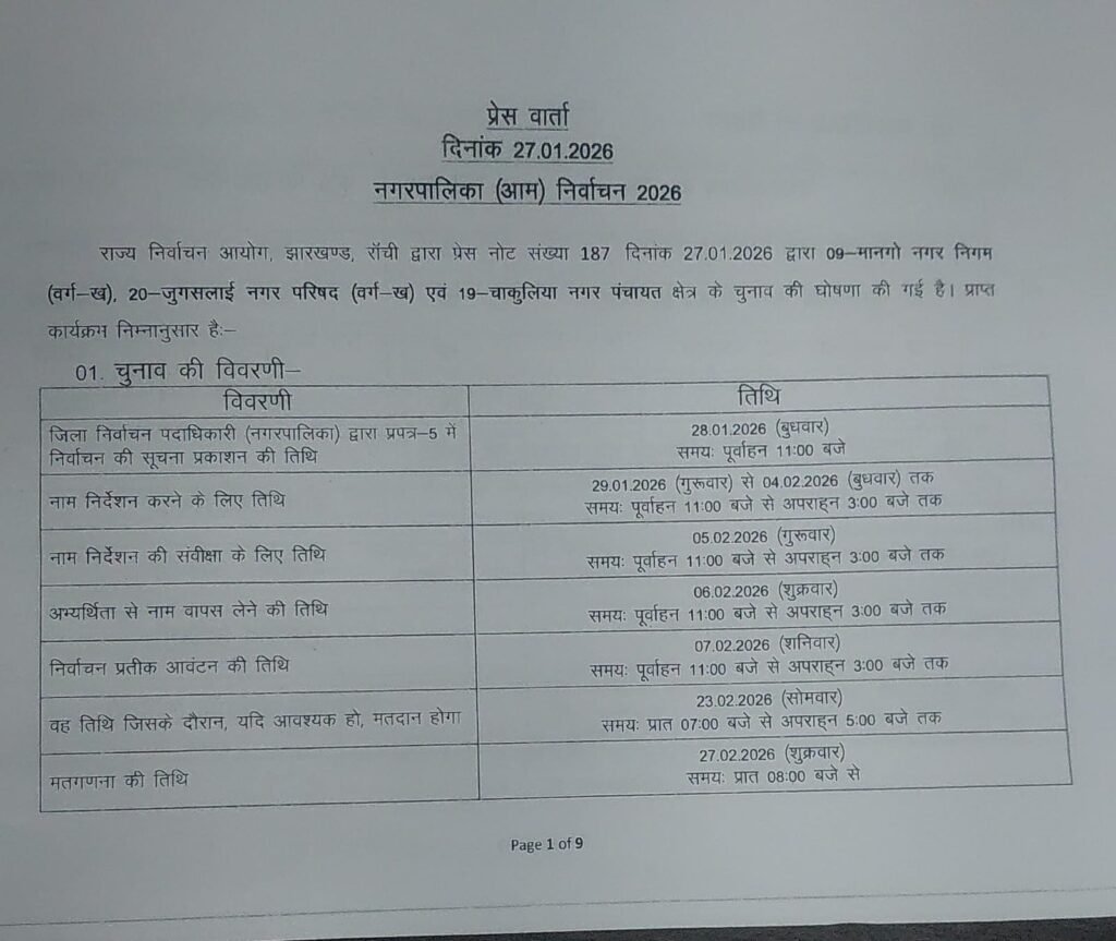 राज्य निर्वाचन आयोग द्वारा नगरपालिका चुनाव–2026 की घोषणा के उपरांत मंगलवार को समाहरणालय सभागार में जिला निर्वाचन पदाधिकारी (नगरपालिका) श्री कर्ण सत्यार्थी ने प्रेस वार्ता आयोजित कर चुनाव से जुड़ी सभी महत्वपूर्ण जानकारियाँ साझा कीं। उन्होंने बताया कि जिले के मानगो नगर निगम, जुगसलाई नगर परिषद एवं चाकुलिया नगर पंचायत में शांतिपूर्ण एवं निष्पक्ष चुनाव संपन्न कराने हेतु व्यापक तैयारियाँ की गई हैं।
