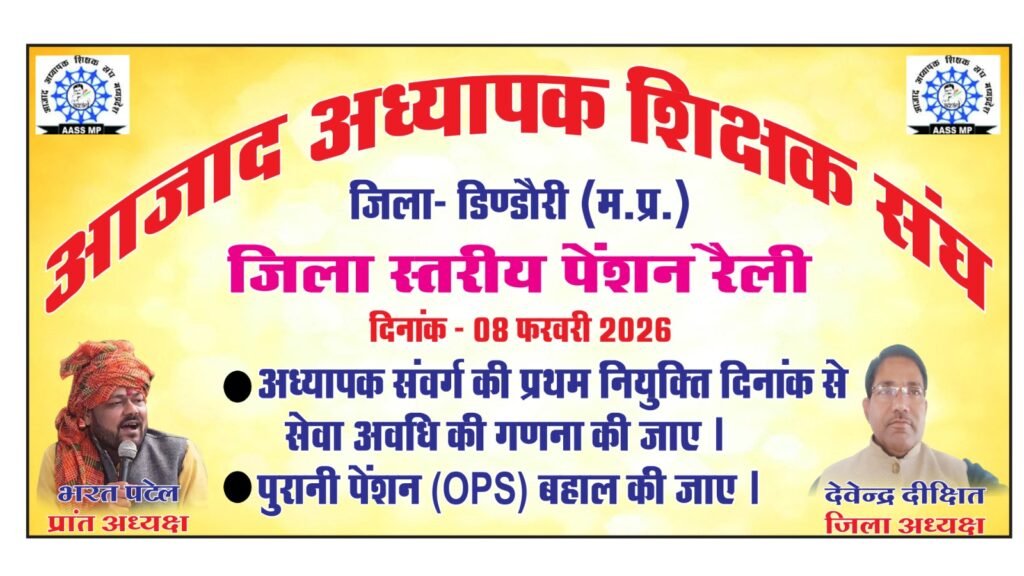 डिंडोरी:- आजाद अध्यापक शिक्षक संघ जिला डिंडोरी द्वारा 8 फरवरी 2026 को जिला मुख्यालय पर आयोजित पुरानी पेंशन बहाली रैली को सफल बनाने के लिए जिले के समस्त विकासखंड के ब्लॉक अध्यक्ष जिला पदाधिकारी से प्रत्येक अध्यापक तक विभिन्न संसाधन से संपर्क अभियान किया जा रहा है जिला अध्यक्ष देवेंद्र दीक्षित ने जिले के समस्त एन.पी.एस.धारी कर्मचारियों समस्त कर्मचारी संगठनो समस्त जिले के अध्यापकों से आग्रह किया है कि प्रांतीय अध्यक्ष भरत पटेल की आवाह्न पर मध्य प्रदेश की संपूर्ण जिले में ज्ञापन दिया जाना है जिससे डिन्डौरी जिले मे भी ज्ञापन दिया जायेगा जिसमें पुरानी पेंशन बहाली वरिष्ठता और ग्रेच्युटी का लाभ प्रथम नियुक्ति दिनांक से देने सहित अन्य मांगों को लेकर कार्यक्रम आयोजित किया गया है दीक्षित ने अपने विज्ञप्ति में बताया है कि दिनांक 8 फरवरी 2026 को भगवान बिरसा मुंडा मैदान पुरानी डिंडोरी में सभा आयोजित होगी इसके बाद रैली निकाली जाएगी सभा एवं रैली उपरांत मुख्यमंत्री को संबोधित ज्ञापन कलेक्टर डिण्डौरी  को अपनी लंबित मांगों के संबंध में ज्ञापन सौंपा जाएगा संघ की प्रमुख मांगो मे ई- अटेंडेंस प्रणाली को तत्काल बंद करना अध्यापक संवर्ग एवं गुरुजियों की सेवा अवधि की गणना प्रथम नियुक्ति दिनांक से करना पुरानी पेंशन योजना बहाल करना ग्रेच्युटी सहित अन्य वैधानिक लाभ प्रदान करना शिक्षकों की अन्य लंबित मांगों का शीघ्र निराकरण शामिल है संघ ने  जिले की शत- प्रतिशत  शिक्षको से आवाह्न किया है कि अपनी उपस्थिति से आंदोलन को सदैव सफल किया है एक बार  पुनः अपने -अपने साथियों को सूचित कर ज्यादा-ज्यादा संख्या मे कार्यक्रम स्थल पर पहुंचने की अपील की