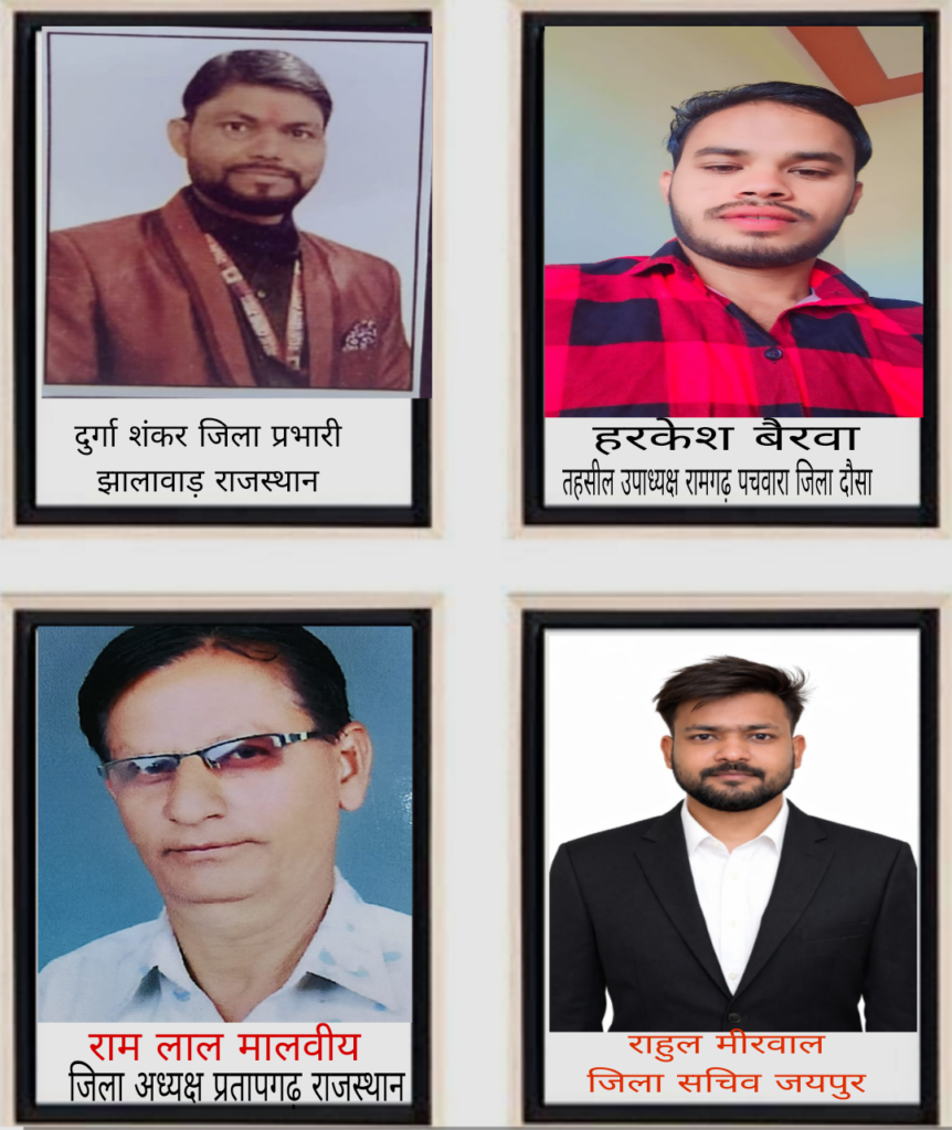 खबर जयपुर से दिनांक 8 फरवरी 2026 राष्ट्रीय भ्रष्टाचार निरोधक एवं मानवअधिकार संस्था के राष्ट्रीय अध्यक्ष एम एल डीडवाना व महासचिव अनिल निमेष की सहमति से संस्था में नई युक्तियां जारी की गई, दुर्गा शंकर जिला प्रभारी झालावाड़, हरकेश बैरवा तहसील उपाध्यक्ष रामगढ़ पचवारा, रामलाल मालवीय जिला अध्यक्ष प्रतापगढ़ राजस्थान, राहुल मीरवाल जिला सचिव जयपुर को नियुक्त किया गया, उन्हें शपथ दिला कर संस्था में ईमानदारी से कार्य करने के दिशा निर्देश दिए।