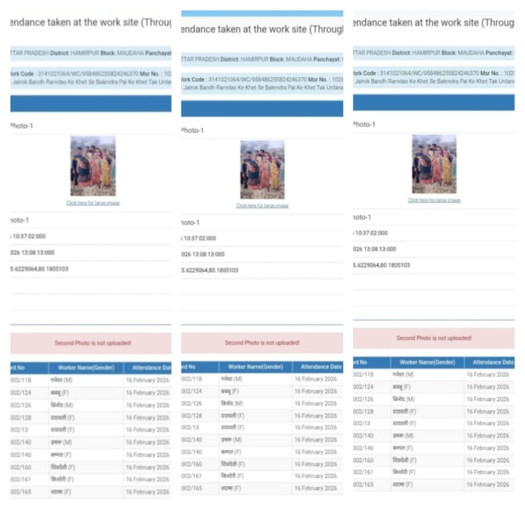 मौदहा (हमीरपुर)। महात्मा गांधी राष्ट्रीय ग्रामीण रोजगार गारंटी योजना (मनरेगा) के तहत मौदहा ब्लॉक की ग्राम पंचायत उरदना में दर्ज ऑनलाइन हाजिरी रिकॉर्ड ने पारदर्शिता पर गंभीर सवाल खड़े कर दिए हैं। एनएमएमएस (NMMS) ऐप के माध्यम से अपलोड की गई उपस्थिति में कई संदिग्ध तथ्य सामने आए हैं, जिससे “फर्जी हाजिरी” की आशंका जताई जा रही है।