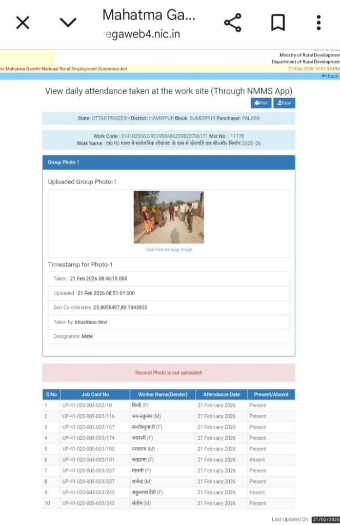 ब्लाक की सभी पंचायत में मनरेगा योजना के कार्यों में मजदूरों की हाजिरी में बड़ा खेल चल रहा है। मास्टर रोल में मजदूरों की अपलोड होने वाली फोटो में मजदूरों की संख्या कुछ और होती है और हाजिरी की संख्या कुछ और होती है ऐसा एक दिन नहीं प्रतिदिन होता है। शनिवार को ग्राम पंचायत पलरा में अपलोड की गई फोटो में कुछ ऐसा ही अंतर नजर आया। फोटो और मस्टर रोल की हाजरी में महिला पुरुष के हाजरी का फर्क भी नहीं देखा जाता है और हाजिरी चढ़ाकर वेबसाइट में अपलोड कर दी जाती है। शुक्रवार को ऐसा ही हाल ग्राम पंचायत सौंखर में किया गया था यहां 5 घंटे में मजदूर ही बदल गए थे। यही सिलसिला सभी पंचायतों में प्रतिदिन चलता है। खंड विकास अधिकारी आशीष कटियार ने कहा कि मामला संज्ञान में नहीं है जांच कराकर कार्यवाही करेंगे।