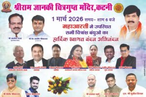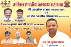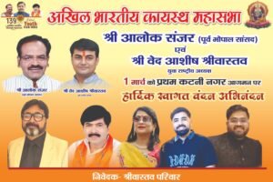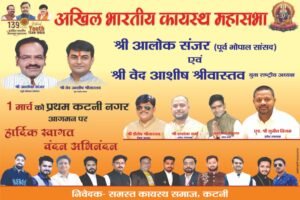 1 मार्च 2026 दिन रविवार को भोपाल के पूर्व सांसद श्री आलोक संजर जी व भारतीय कायस्थ महासभा के राष्ट्रीय युवा अध्यक्ष वेद आशीष श्रीवास्तव जी का कटनी आगमन हो रहा है इस अवसर पर संगठन के पदाधिकारी एवं कार्यकर्ताओं द्वारा उनका स्वागत कार्यक्रम आयोजित किया गया है कार्यक्रम इस प्रकार है