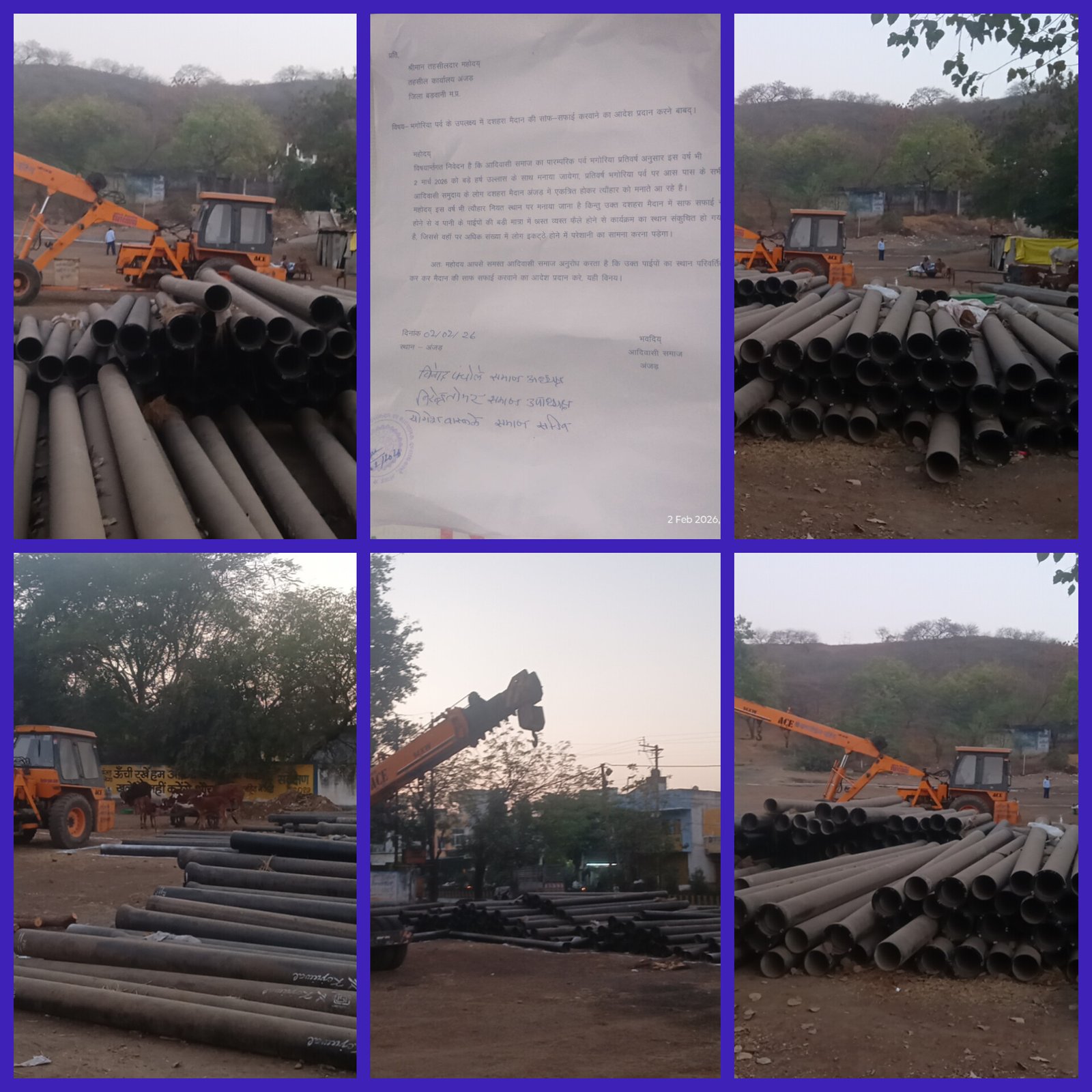 अंजड़ नगर के दशहरे मैदान में भगोरिया उत्साह उल्लास के साथ मनाया जाएगा जिसको लेकर दशहरे मैदान पर जोरों शोर पर तैयारी जारी है जिससे दशहरे मैदान पर 2 से 3 हजार पाइपलाइन ढेर लगा हुआ है दशहरा मैदान में आसपास अतिक्रमण भी होता हुआ जिससे चद्दर का मकान बना हुआ जिससे नगर पालिका का कोई ध्यान नहीं और 1 महीने पहले आवेदन देने के बाद भी अभी तक कोई कार्यवाही नहीं की गई और अंजड़ नगर परिषद सोया हुआ है दशहरा मैदान पर भगोरिया उत्साह उल्लास के साथ मनाया जाता है तथा 25 से 30 हजार पब्लिक आती है और त्योहार के समय मैदान में अतिक्रमण हो और उसको हटाया नहीं जाए तो इसका मतलब नगर परिषद सोया हुआ है आप देखते खबर लगने के बाद कितना असर होता है।