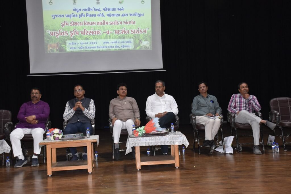 મહેસાણા ખેડૂત તાલીમ કેન્દ્ર અને ગુજરાત પ્રાકૃતિક વિકાસ બોર્ડ દ્વારા કૃષિ કૌશલ્ય વિકાસ તાલીમ કાર્યક્રમ અંતર્ગત પંડિત દિનદયાળ ઉપાધ્યાય ટાઉન હોલ, મહેસાણા ખાતે “પ્રાકૃતિક કૃષિ પરિસંવાદ-વ-પ્રદર્શન કાર્યક્રમ” યોજાયો હતો.