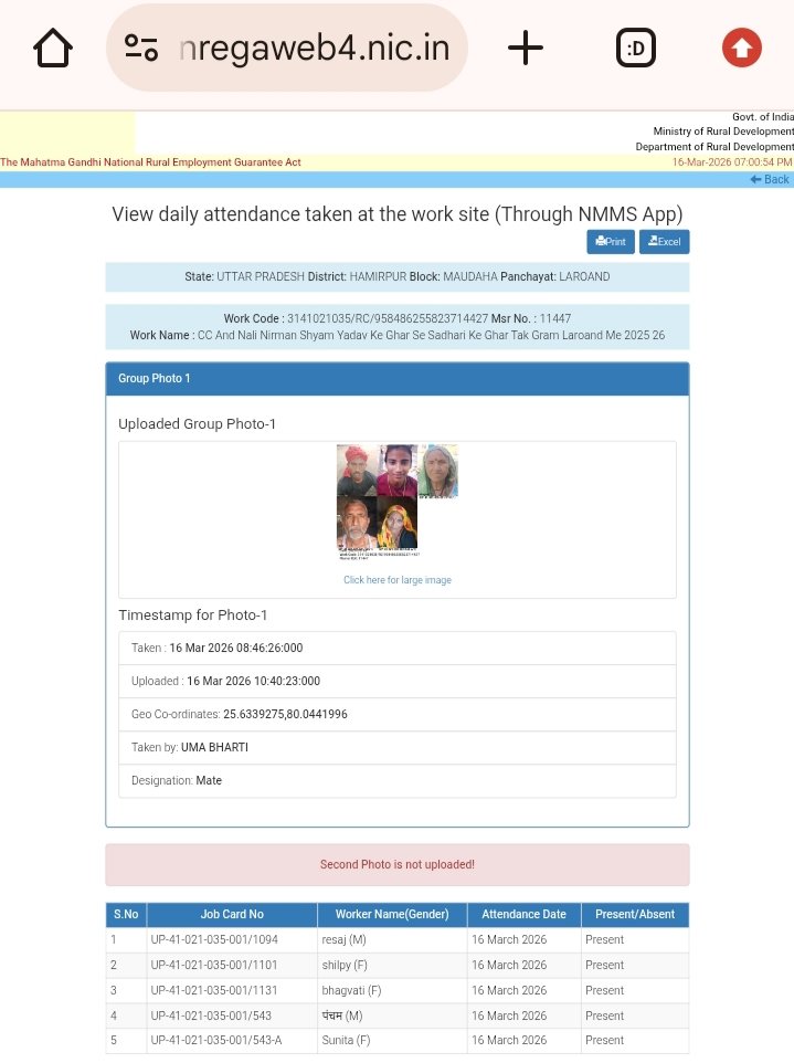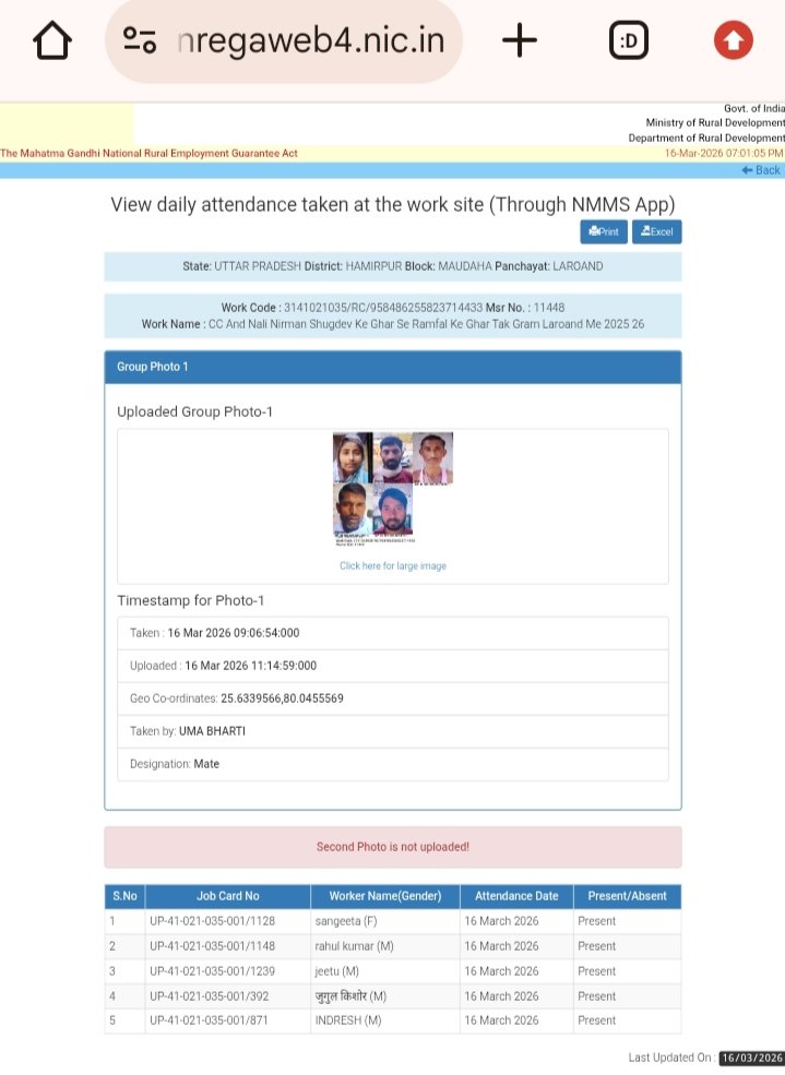 सोमवार को एनएमएमएस पोर्टल पर अपलोड हुई हाजिरी की तस्वीरों और कार्य विवरण ने कई गंभीर सवाल खड़े कर दिए। एक ही दिन में ग्राम पंचायत लरौंड में अलग-अलग स्थानों पर कई सीसी व नाली निर्माण कार्यों में मजदूरों की उपस्थिति दर्ज दिखाई गई, लेकिन हर कार्य में दूसरी फोटो अपलोड नहीं की गई, जिससे पारदर्शिता और वास्तविक कार्य की स्थिति पर संदेह गहरा गया है।