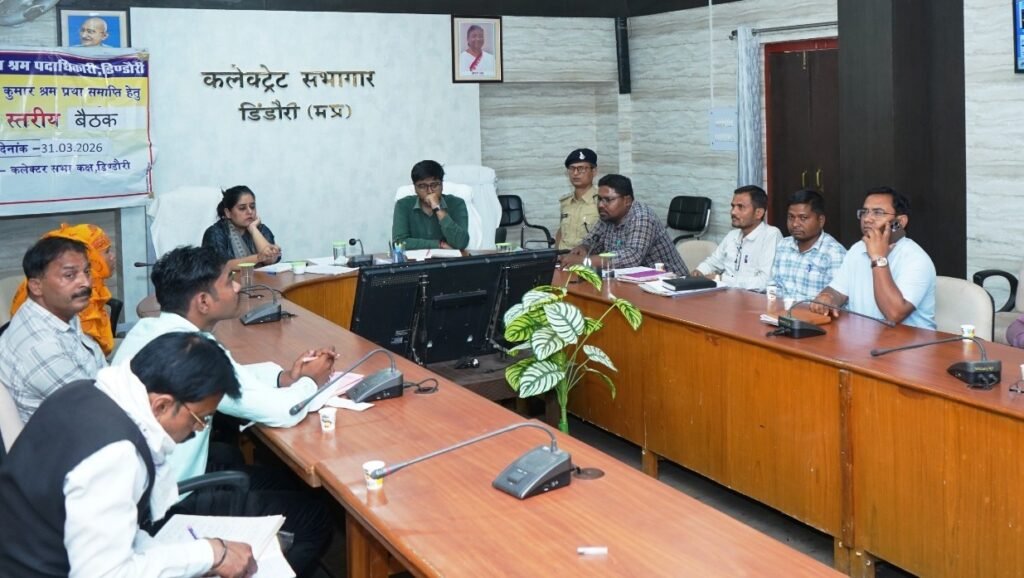 डिंडौरी आज दिनांक 31 मार्च 2026 को डिंडोरी जिले में कलेक्टर सभागार में मुख्य कार्यपालन अधिकारी जिला पंचायत दिव्यंशु चौधरी, पुलिस अधीक्षक, श्रीमति वाहनी सिंह , जिला श्रम कार्यलय डिंडौरी, महिला एवं बाल विकास, जिला शिक्षा अधिकारी, मुख्य चिकित्सा एवं स्वास्थ्य अधिकारी, सहायक आयुक्त जनजातीय कार्यविभाग, अग्रणी जिला प्रंबधक एवं एनजीओ जनसाहस की उपस्थिति में जिला टास्क फोर्स समिति एवं जिला सतर्कता समिति की बैठक संपन्न हुई।