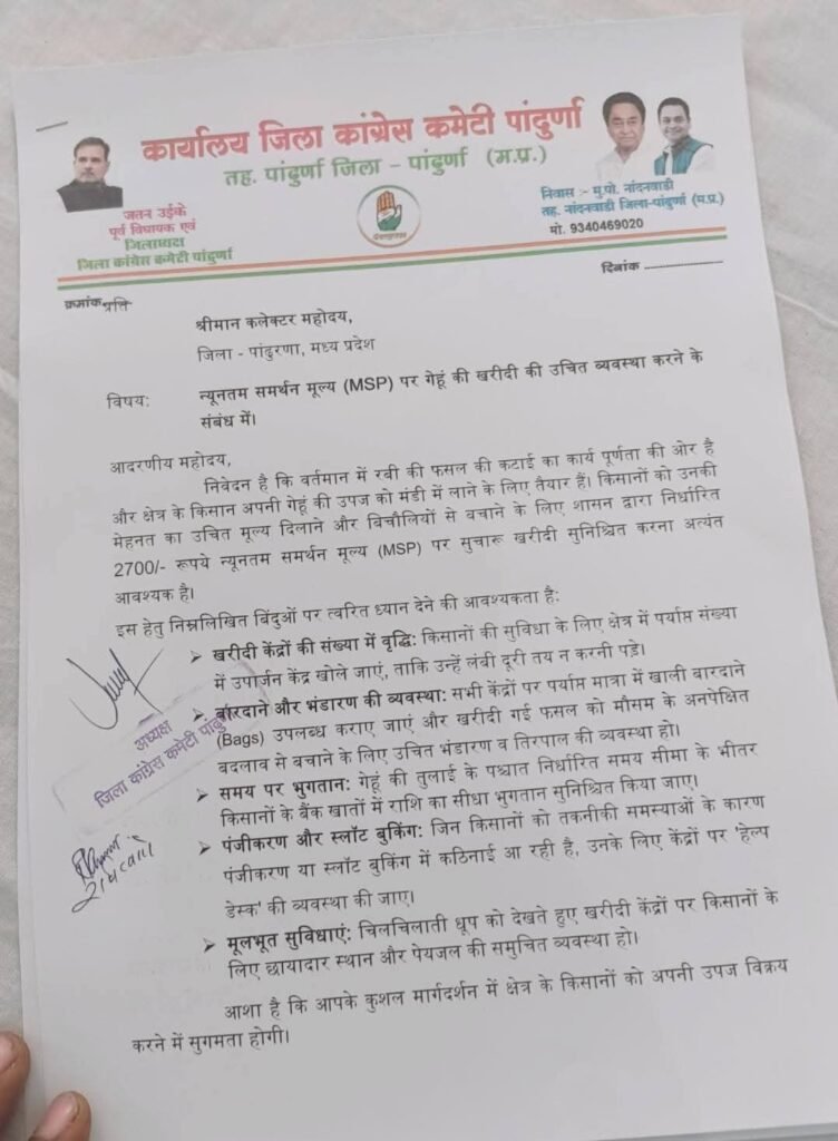 रबी सीजन के अंतिम दौर में किसानों की समस्याओं को लेकर जिला कांग्रेस कमेटी पांढुरना ने कलेक्टर नीरज कुमार वशिष्ठ को ज्ञापन सौंपा। ज्ञापन में न्यूनतम समर्थन मूल्य (MSP) पर गेहूं खरीदी की व्यवस्था को लेकर गंभीर सवाल उठाते हुए तत्काल सुधार की मांग की गई।