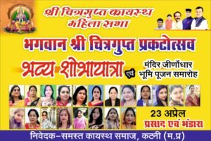 कटनी। कायस्थ समाज द्वारा आराध्य देव भगवान श्री चित्रगुप्त का प्रकटोत्सव आगामी 23 अप्रैल को हर्षोल्लास के साथ मनाया जाएगा। इस गौरवमयी अवसर पर शहर में भव्य शोभायात्रा निकाली जाएगी और धार्मिक अनुष्ठानों की श्रृंखला आयोजित की जाएगी।