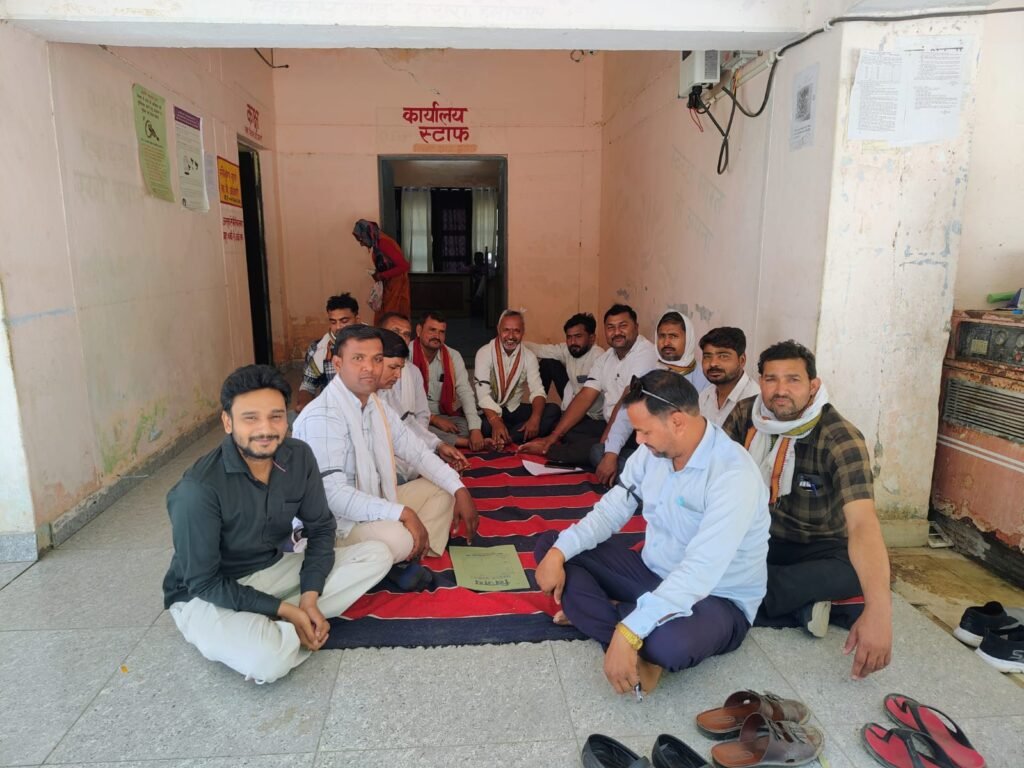 धरना स्थल पर बैठे रोजगार सेवक संजय कुमार, गुलाब सिंह, प्रवीण कुमार