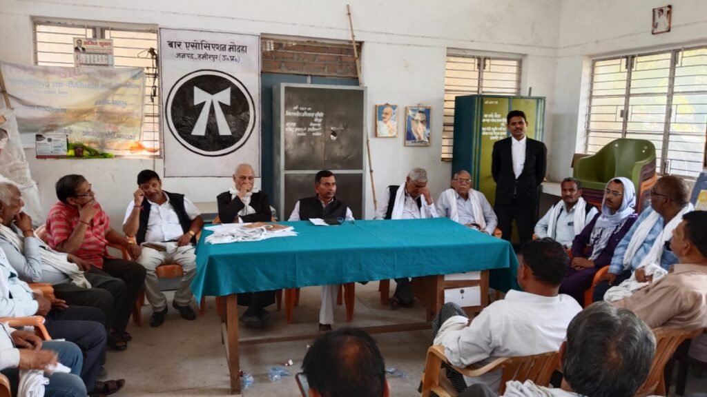 मौदहा हमीरपुर। बार एसोसिएशन मौदहा की बैठक एल्डर कमेटी के चेयरमैन हयात अहमद एडवोकेट की मौजूदगी व सदस्य मूलचंद एड0 की अध्यक्षता में आयोजित हुई, जिसका संचालन एडवोकेट उमाशंकर त्रिपाठी ने किया। बैठक में अधिवक्ताओं ने संगठन की एकता और सामूहिक निर्णय प्रक्रिया को मजबूत बनाए रखने पर जोर दिया। इस दौरान एडवोकेट जयप्रकाश शुक्ला, विनय तिवारी, ज्ञानचंद द्विवेदी, मूलचंद राजपूत, काज़ी अजमत और कामता प्रसाद निगम सहित कई अधिवक्ताओं ने अपने विचार रखे।